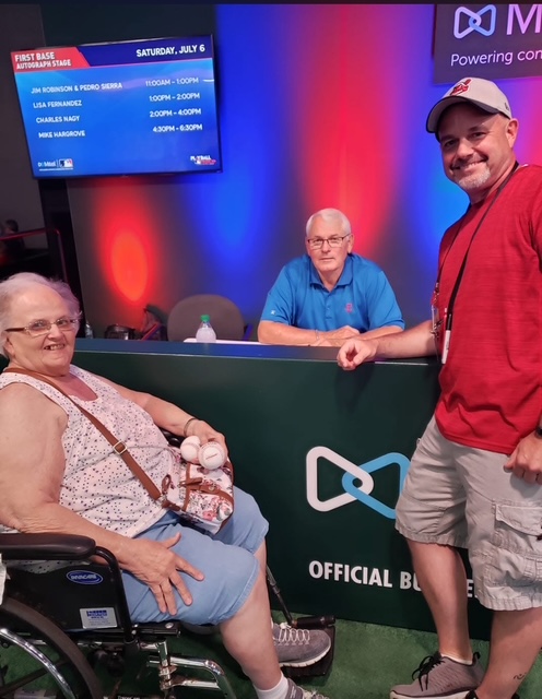 At the All-Star game in Cleveland during Play Ball fest her son Tom took her around to experience the festivities. Jean had won a door prize that allowed her to get an autograph from a random player. She actually ended up in line to meet Hargrove and get his autograph. Tom asked Hargrove if he recalled the letter from his mother and while he didn’t remember the specifics he looked disheartened and said ,“I hope she’s still not mad at me!” He went on to take photos with Tom and Jean while telling them he rarely responded to fan letters, so Jean was quite the exception.
