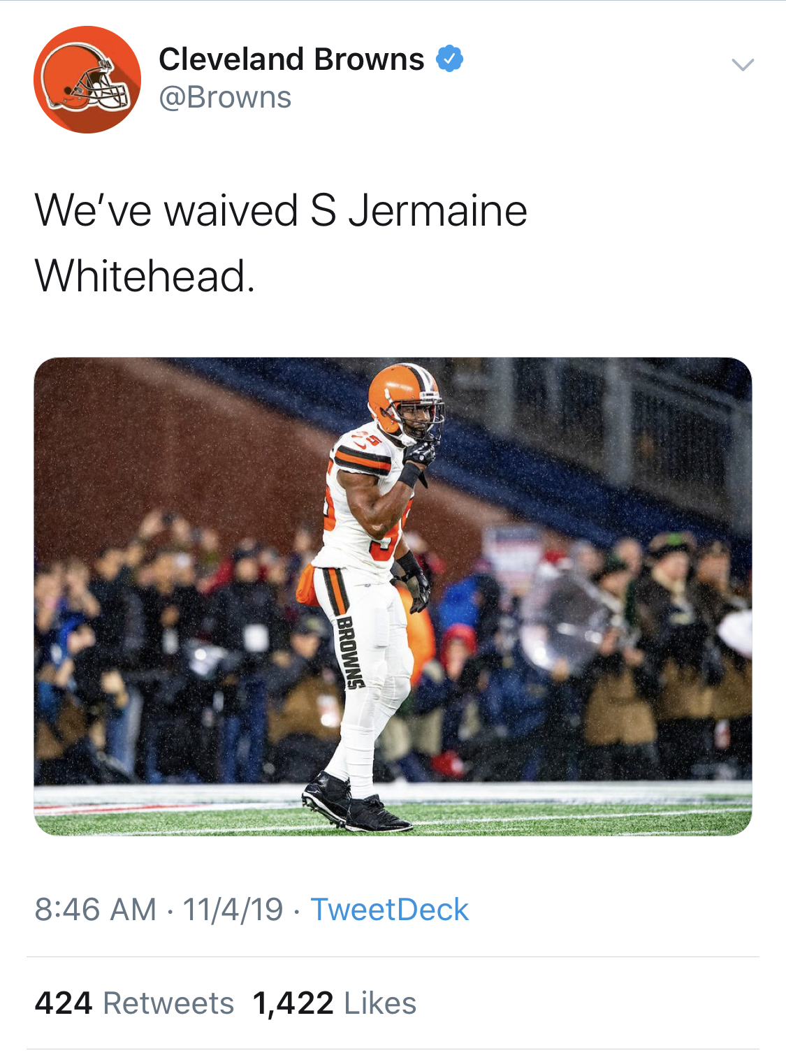After a post game social media tirade that included making a death threat at local radio personality Dustin Fox, the Browns wasted no time Monday in waiving safety Jermaine Whitehead.