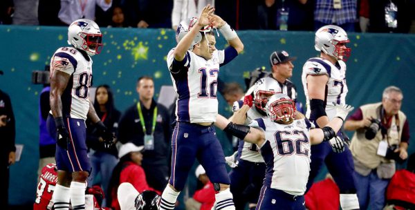 Tom Brady and Joe Thuney of the New England Patriots celebrate a 34-28 overtime win against the Atlanta Falcons in Super Bowl 51. (Photo by Al Bello/Getty Images)