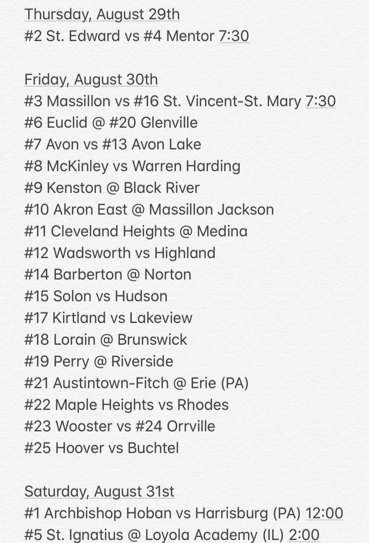 And if you’re looking ahead to week one – here’s the ‘Top 25’ Schedule, also provided by Northeast Ohio HS Sports:
