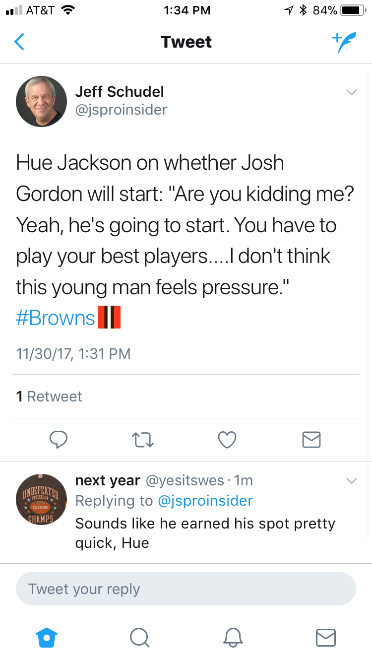 Coach Hue Jackson said today that Gordon will be in the starting lineup for the Browns when they look again for win number one against the Chargers.