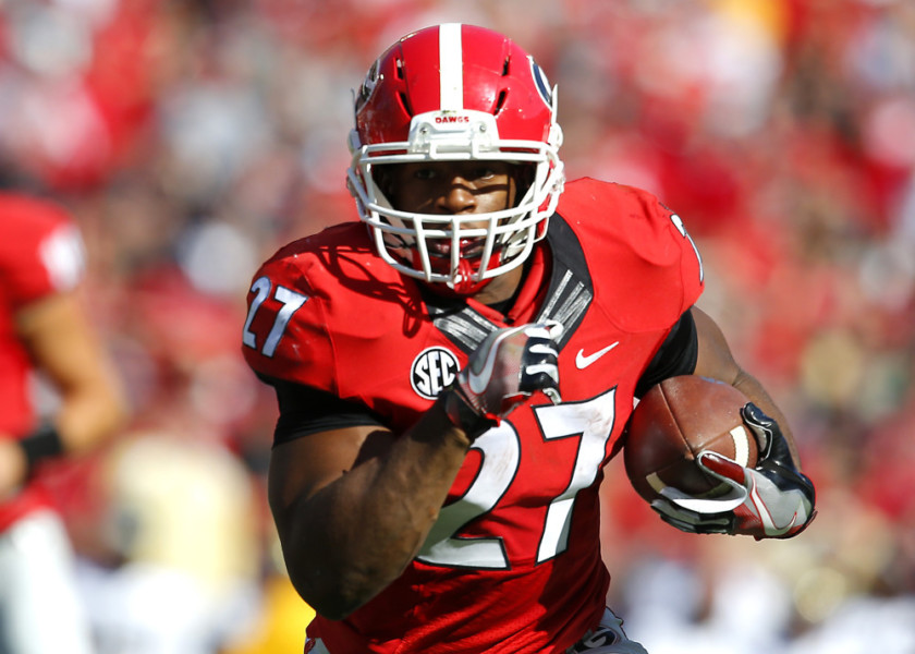 ATHENS, GA – NOVEMBER 26: Georgia Bulldogs running back Nick Chubb (27) rushes during first half action of an NCAA football game between the Georgia Tech Yellow Jackets and Georgia Bulldogs on November 26, 2016, at Sanford Stadium in Athens, GA. (Photo by Todd Kirkland/Icon Sportswire)